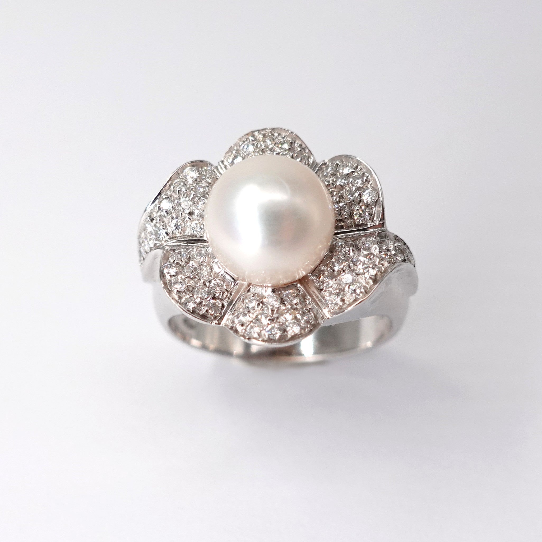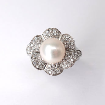 Anello in oro bianco 18kt con diamanti taglio brillante (0.41 kt.) e perla centrale (diametro 8,5x9)