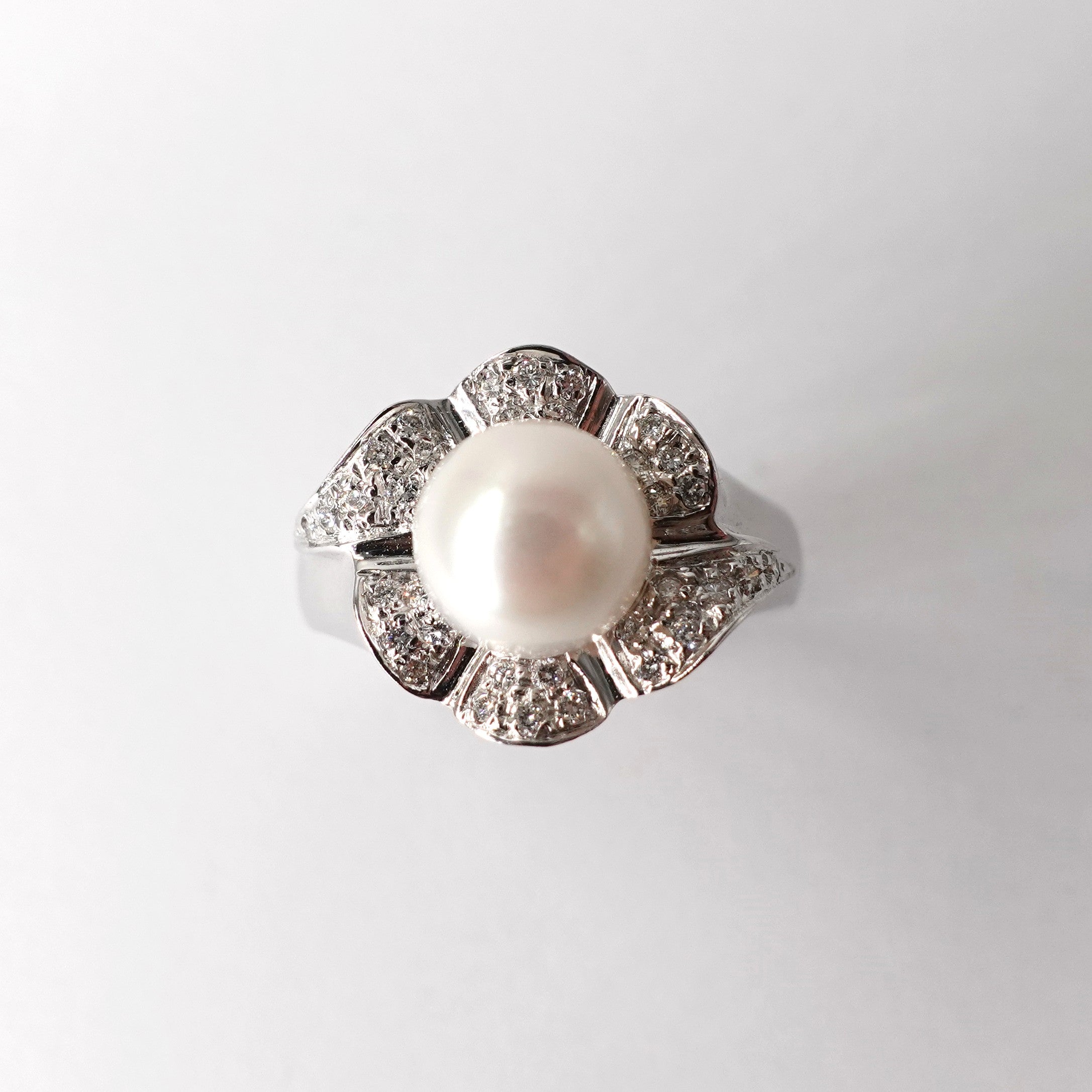 Anello in oro bianco 18kt con diamanti taglio brillante (0,20ct) e perla centrale (diametro 7,5 x 8)