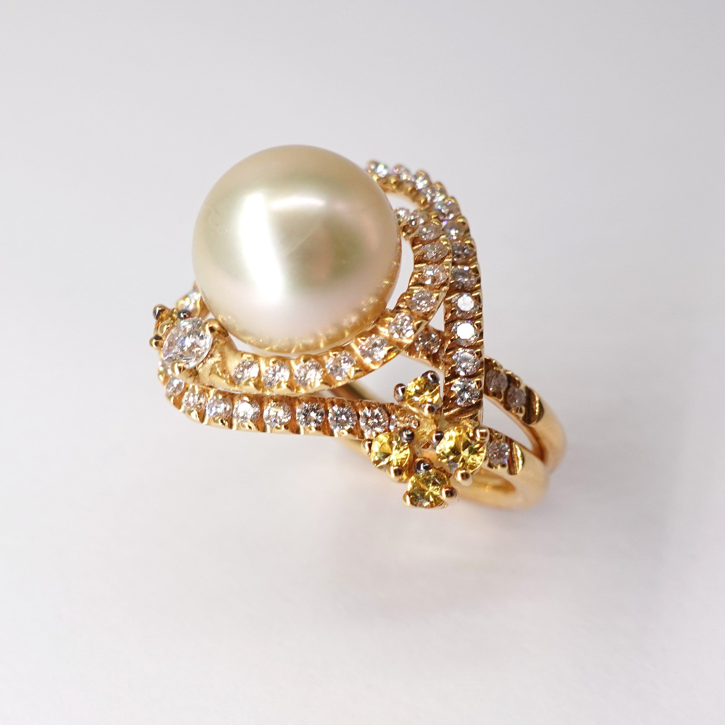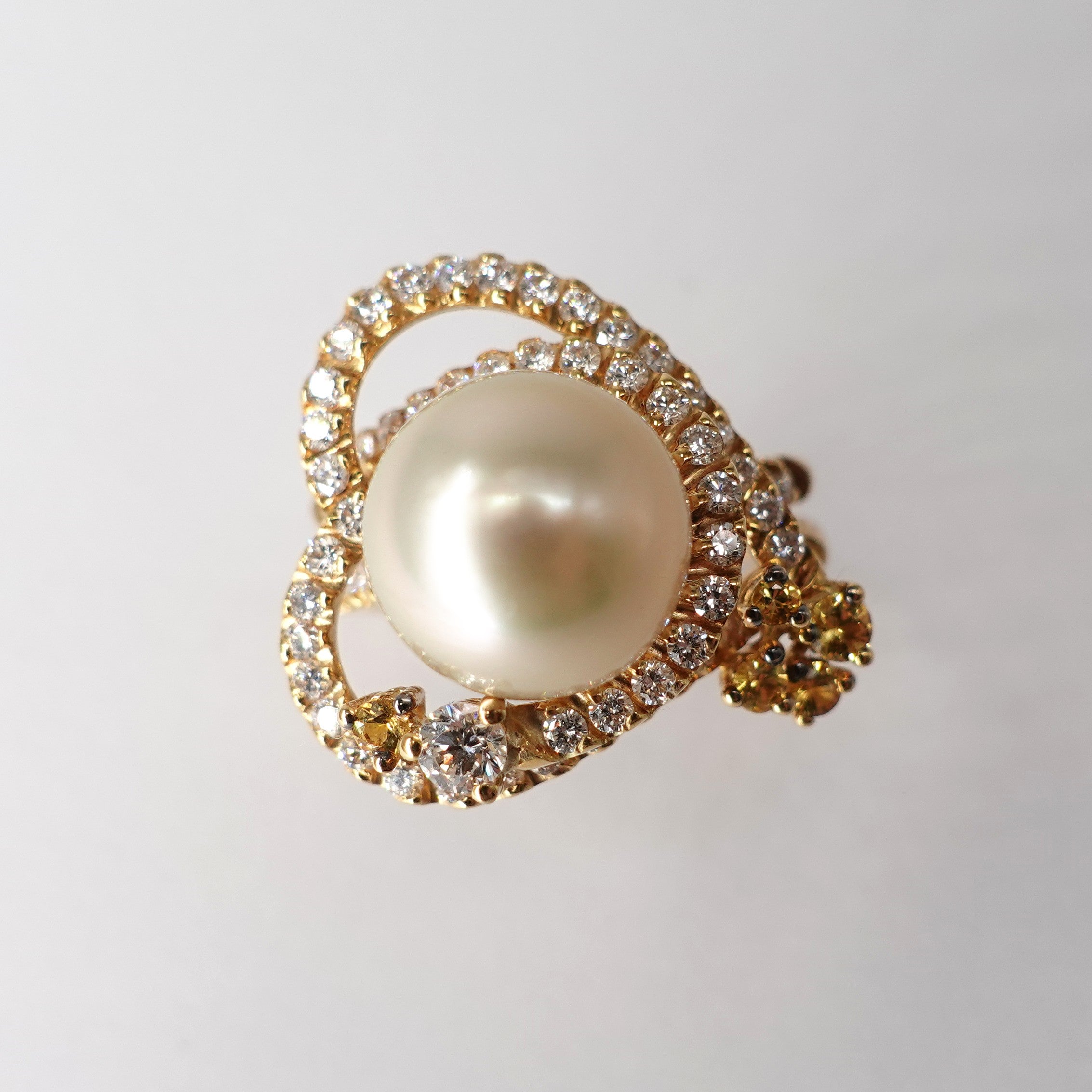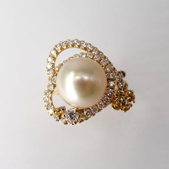 Anello in oro giallo 18kt con cuore di diamanti taglio brillante (1,26ct) e perla centrale.